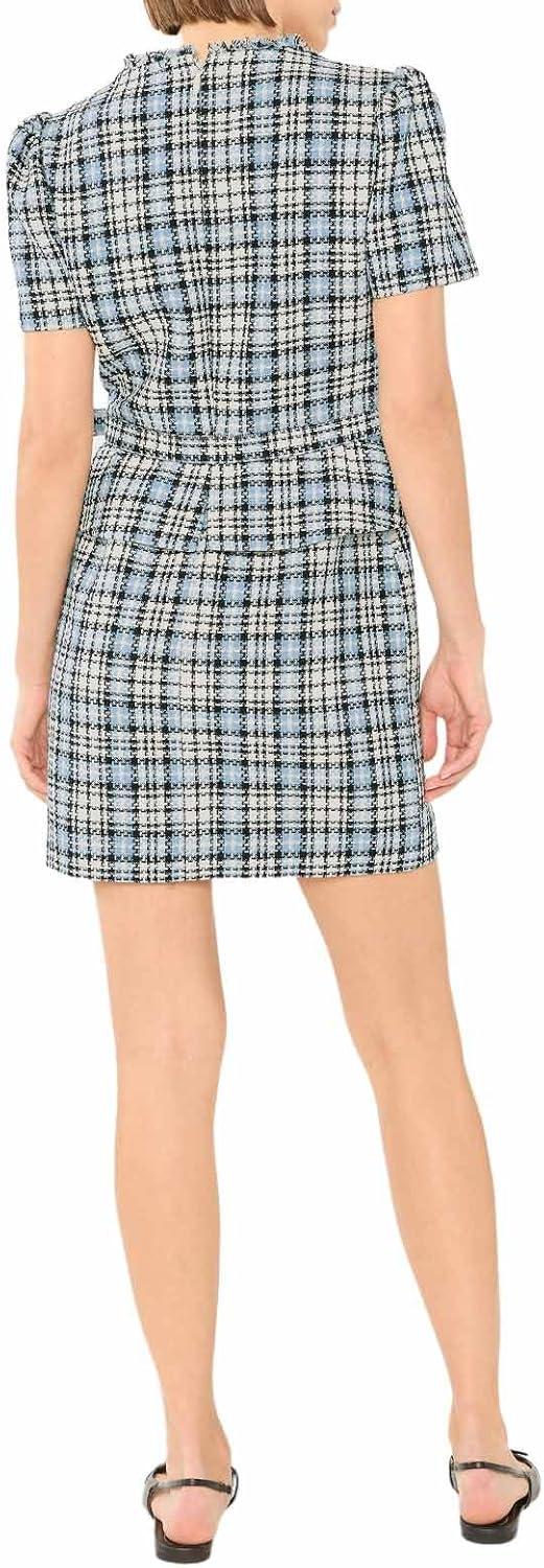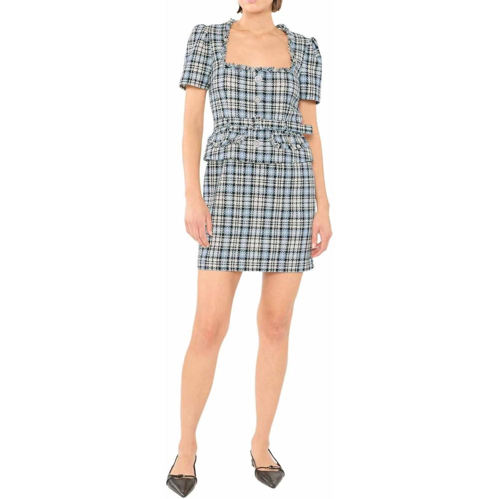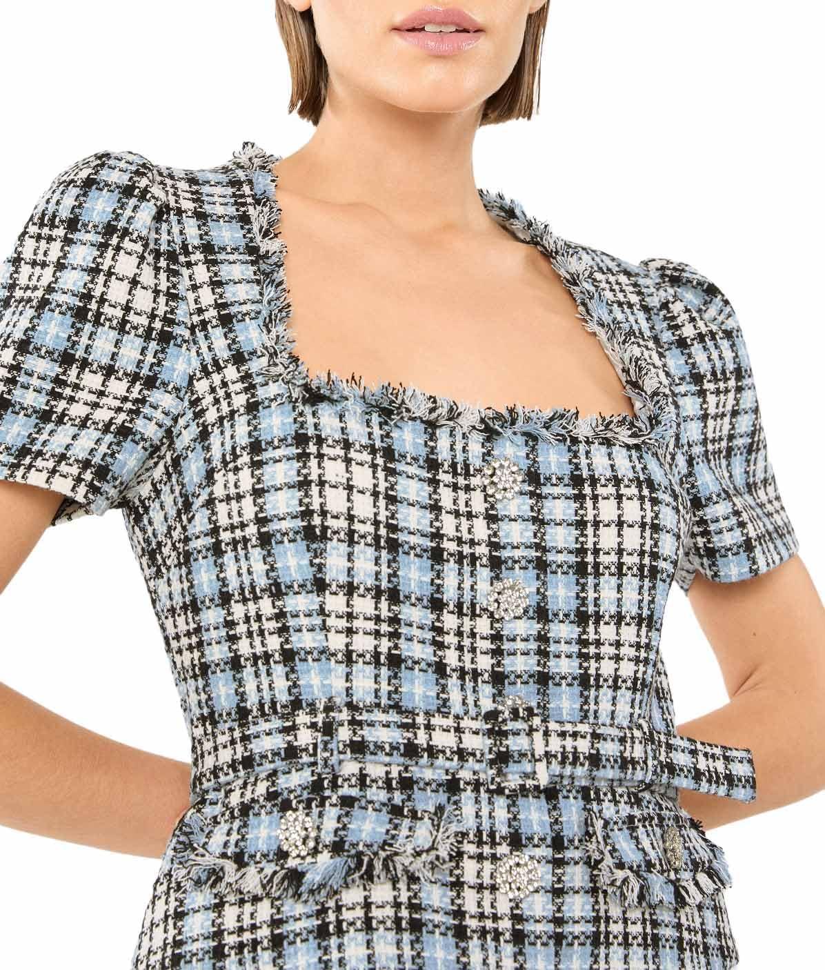 The Cecelia dress features a plaid tweed fabric, along with a belted waist, and embellished buttons.