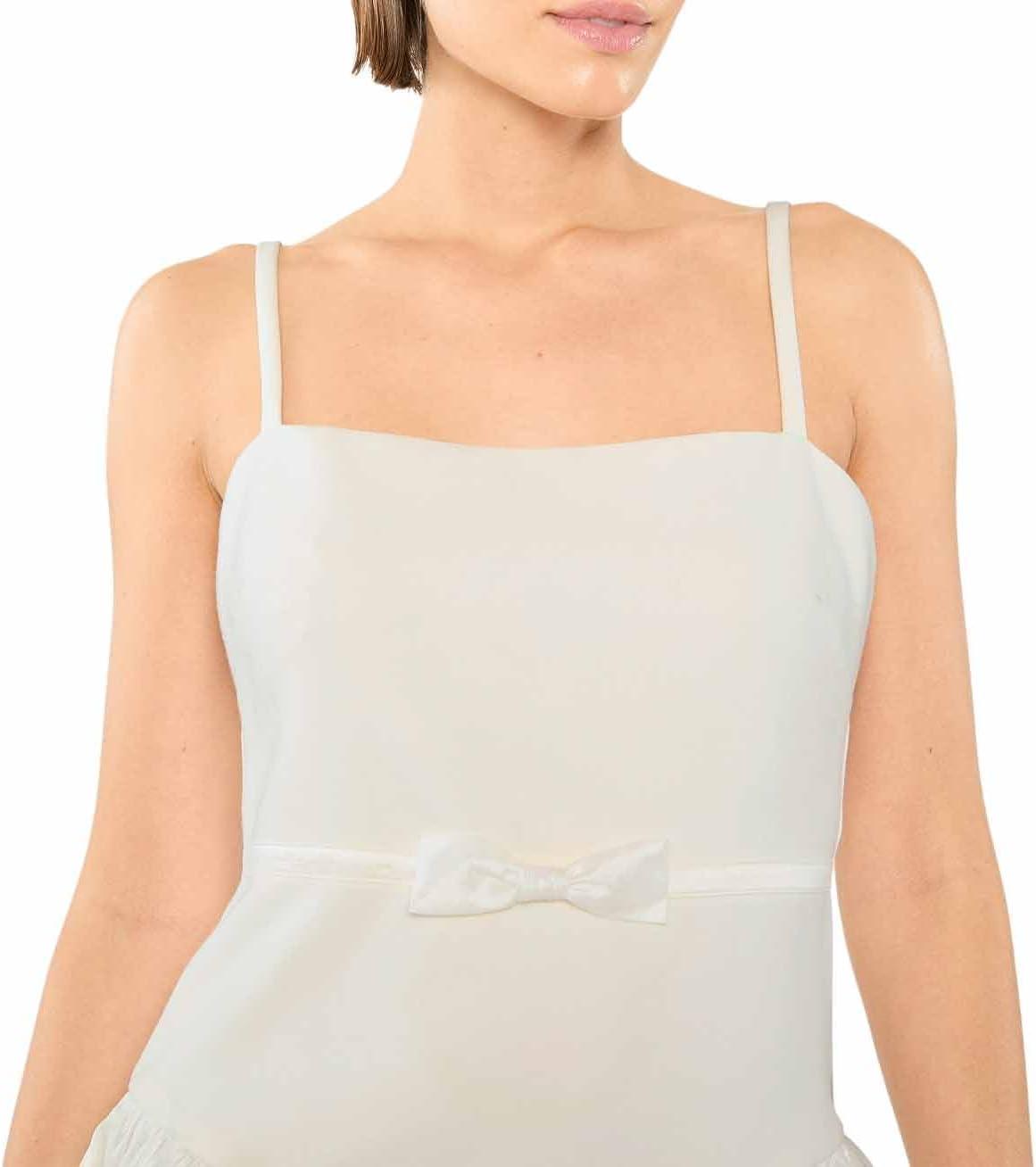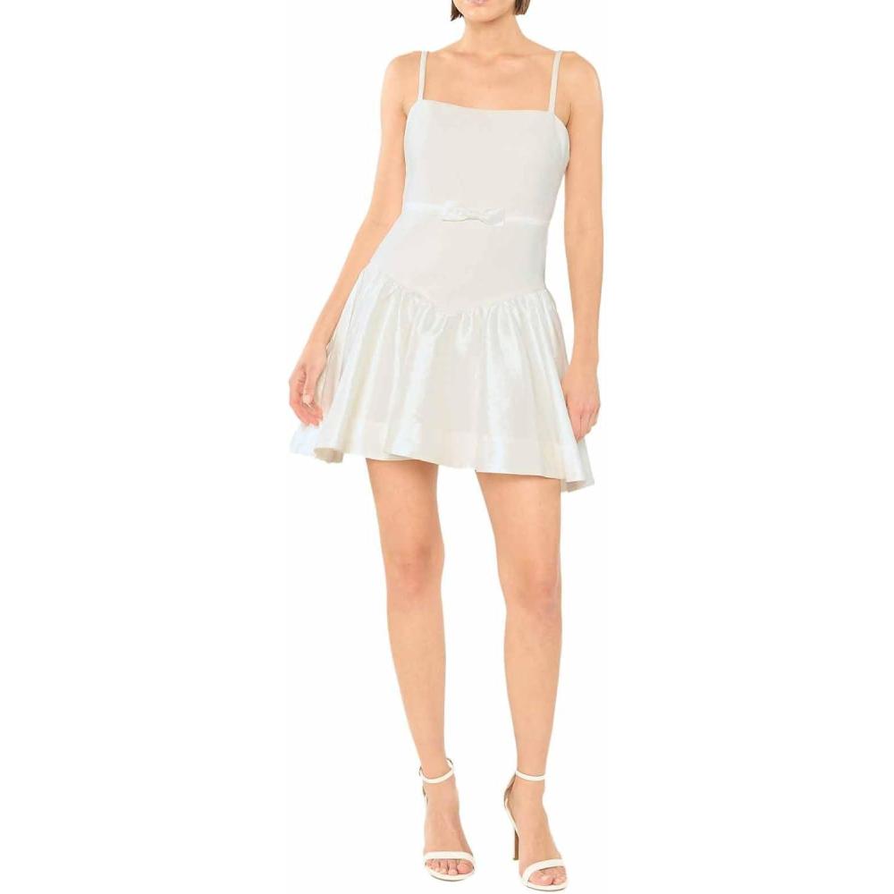 The Edaline dress is a mixed media mini dress, with a bow at the waist.
