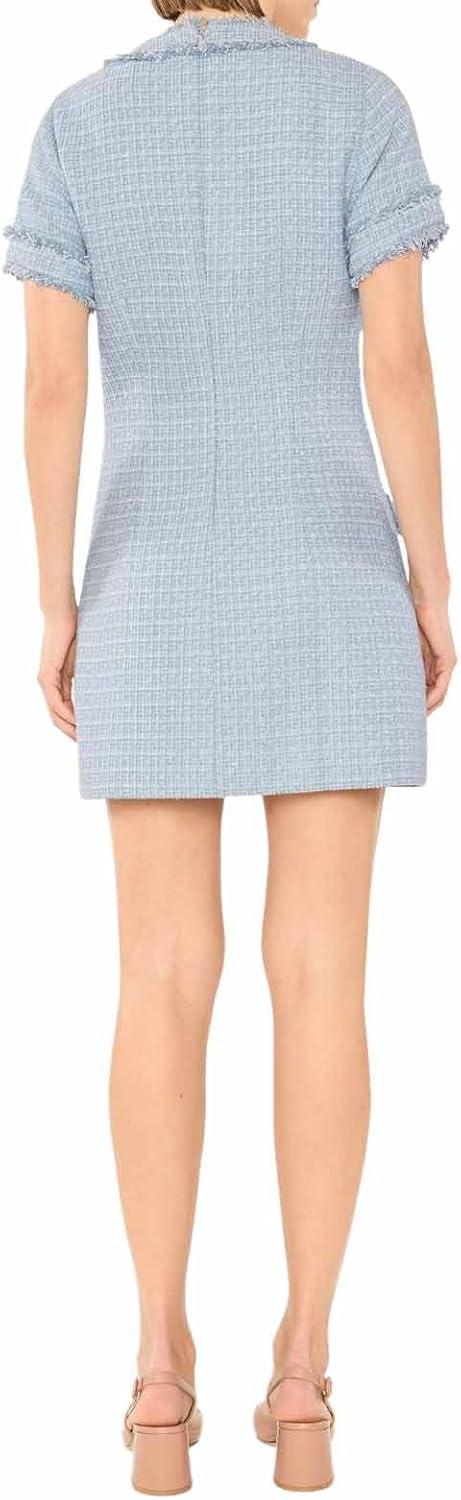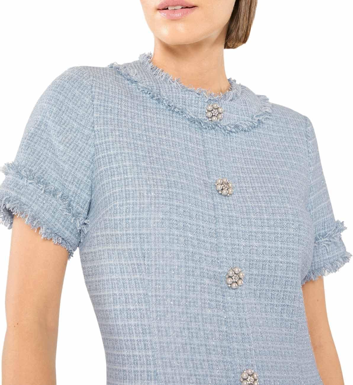 The Lenetta dress is a tweed fabric with embellished buttons and frayed hem detailing.