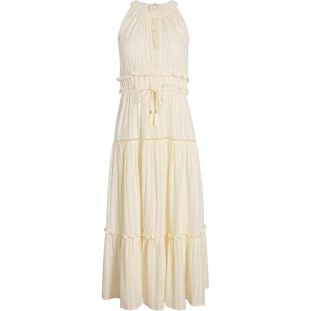 Lightweight cotton day dress with a keyhole neck and pull ties at the waist.