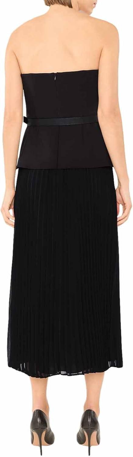 The Valora dress features a pleated skirt and belted waist, along with faux leather accents.